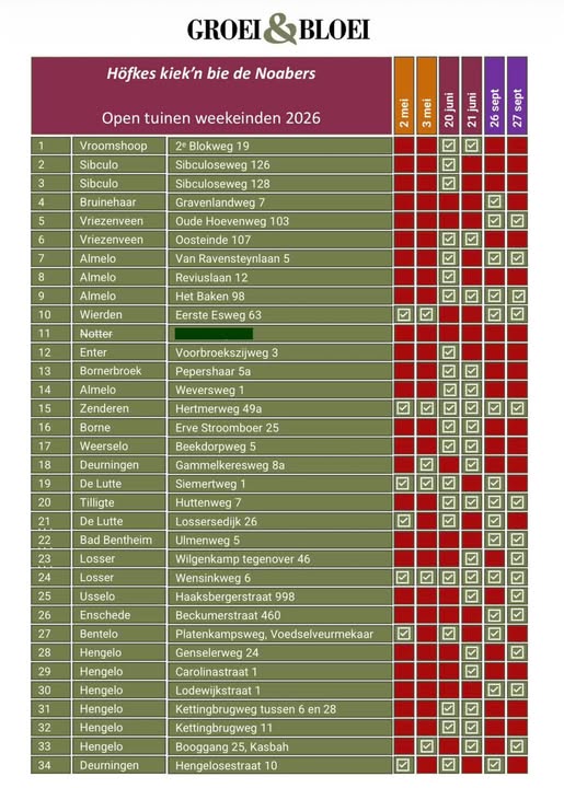 Omdat het eerste weekend al op 2 en 3 mei valt hebben we helaas een aantal mensen moeten teleurstellen. Ze waren te laat met de aanmelding. De flyer en de presentatie waren al gedrukt en klaar voor de site. We hopen dat ze zich voor 2027 opnieuw zullen aanmelden, want iedere tuin is meer dan welkom. Mocht je van plan zijn om in 2027 deel te nemen, meld je dan vroeg aan zodat we de tijd hebben om alles zo goed mogelijk te organiseren.